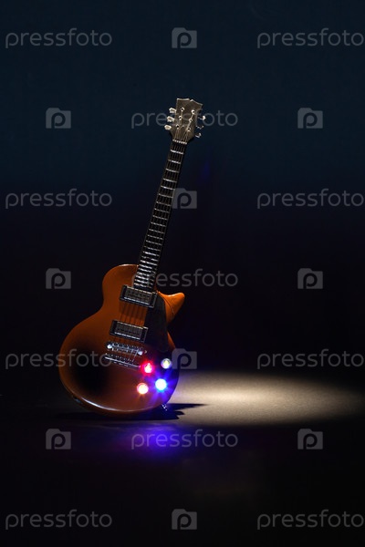Электрическая гитара, освещенная лучом света на черном фоне