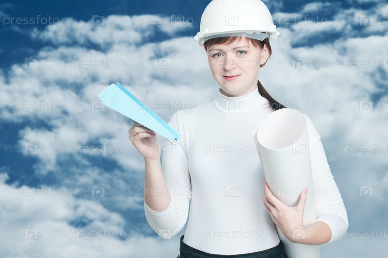 Авиационный инженер с бумажным самолетиком и чертежами в руках