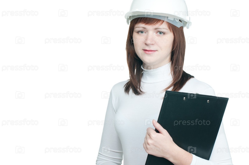 Молодая женщина-архитектор с планшетом в руках, на белом фоне