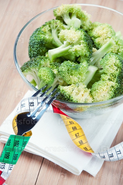 Концепция диетического питания: свежая брокколи и вилка с сантиметровой лентой