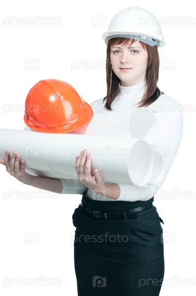 Женщина-инженер с чертежами и строительной каской в руках на белом фоне