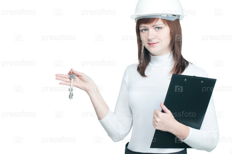 Женщина-архитектор с ключами в руках на белом фоне