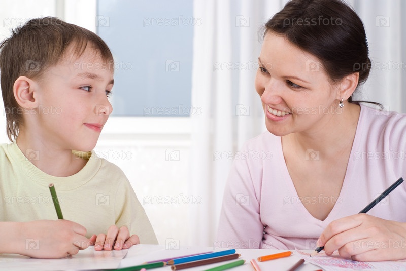 Мать и сын рисуют карандашами