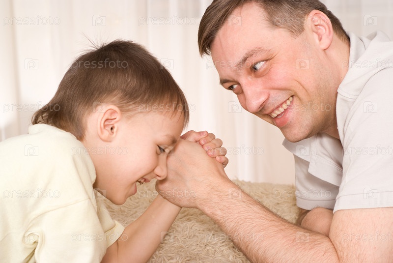 Отец и сын лежат на ковре и борются на руках
