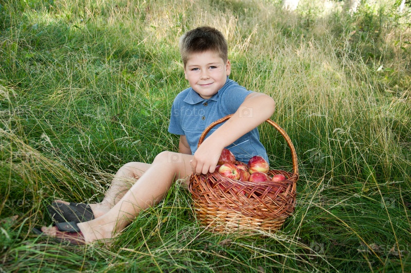 Мальчик с корзиной красных яблок в саду
