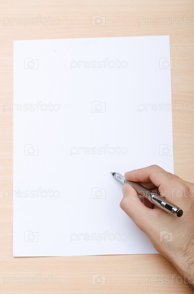 Лист бумаги и ручка в руке пишущего, шаблон