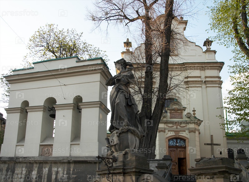 Статуя и колокольня возле церкви Святого Антония в городе Львов, Украина