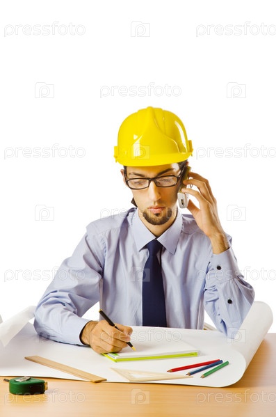 Молодой архитектор с чертежами на белом фоне