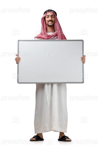 Араб в национальной одежде с белой доской