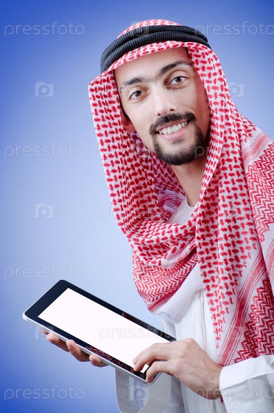 Араб в национальной одежде с планшетным компьютером