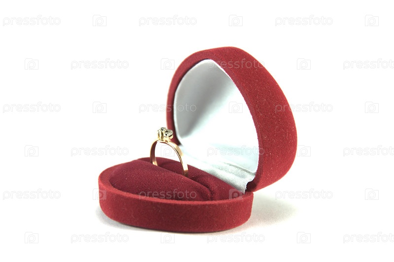Золотое кольцо в красной коробочке в виде сердца на белом фоне