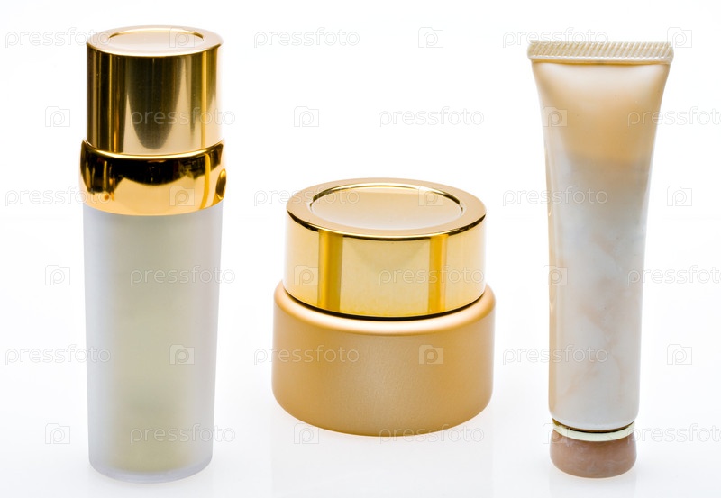 Флакончики с косметическими средствами на белом фоне