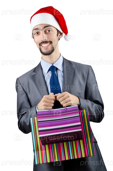 Предприниматель в новогоднем колпаке с подарками