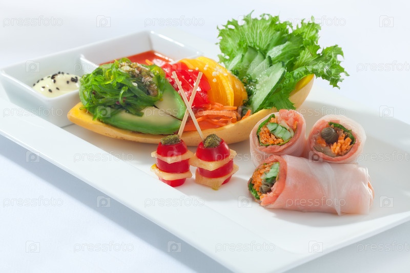 Рыбные рулетики, канапе с овощами и зеленью на тарелке