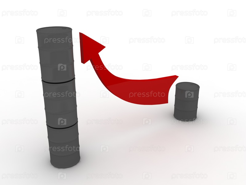 Красная стрелка, поднимающаяся вверх от одной металлической бочки к стопке из трех бочек. Нефтяная промышленность