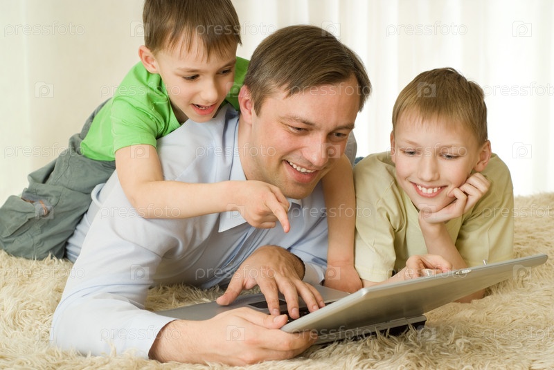 Два брата и их отец играют на ноутбуке