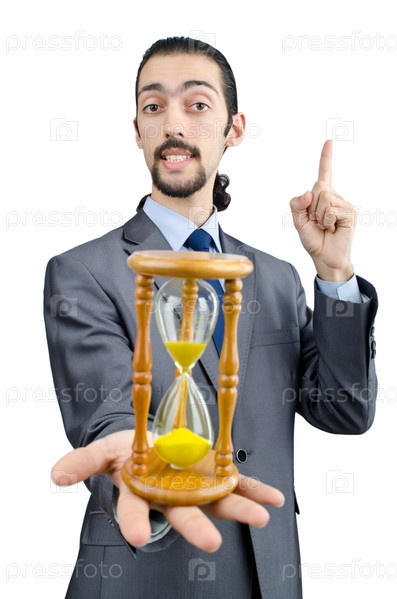 Молодой предприниматель с песочными часами на белом фоне
