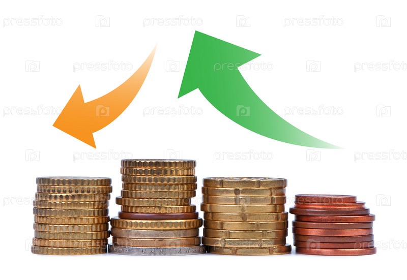Стопки монет и стрелки вверх и вниз на белом фоне