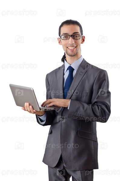 Бизнесмен с ноутбуком на белом фоне