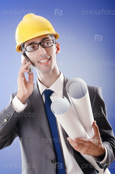 Молодой архитектор в каске и с чертежами