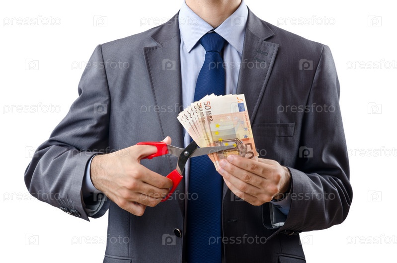 Деловой человек режет деньги, на белом фоне