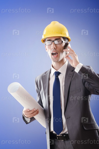 Молодой архитектор в каске разговаривает по телефону