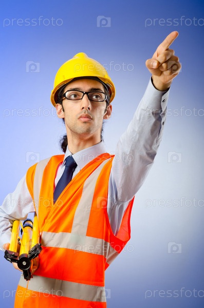 Молодой архитектор в каске указывает пальцем