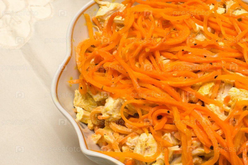 Блюдо с салатом из моркови по-корейски на обеденном столе