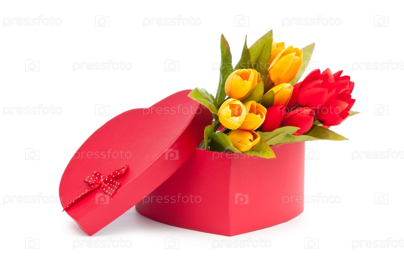 Цветы в красной подарочной коробке на белом фоне
