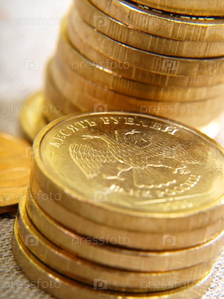 Десятирублевые монеты стопкой крупным планом