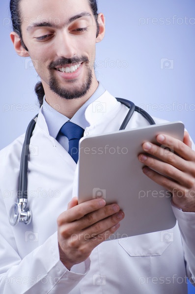 Доктор, работает на планшете