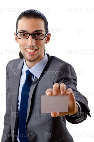 Радостный бизнесмен держит визитку в руке