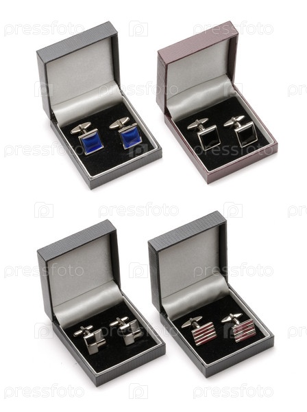 Комплект из четырех видов мужских запонок в футлярах на белом фоне