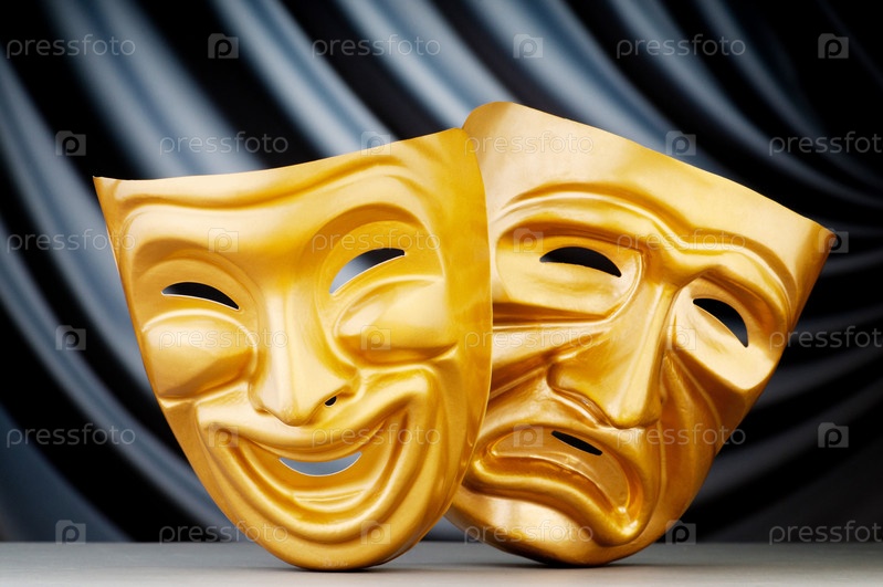 Маски на фоне театрального занавеса