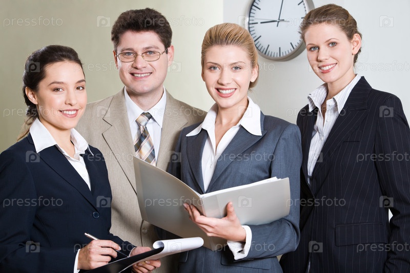 Группа из четырех успешных профессионалов, смотрящих на камеру в офисе