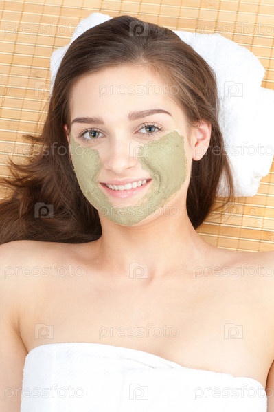 Молодая красивая девушка с маской из глины на лице, лежащая на бамбуковом коврике в спа-салоне