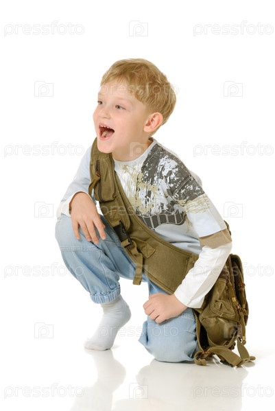 Красивый светловолосый мальчик с зеленой сумкой на белом фоне