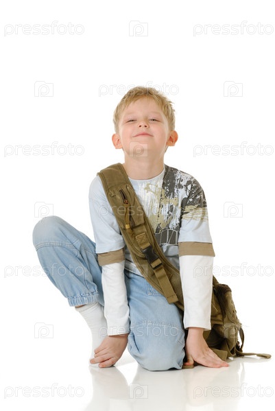 Красивый светловолосый мальчик с зеленой сумкой на белом фоне