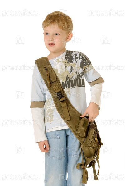 Красивый светловолосый мальчик с зеленой сумкой на белом фоне