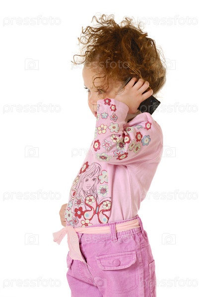 Маленькая девочка с телефоном на белом фоне