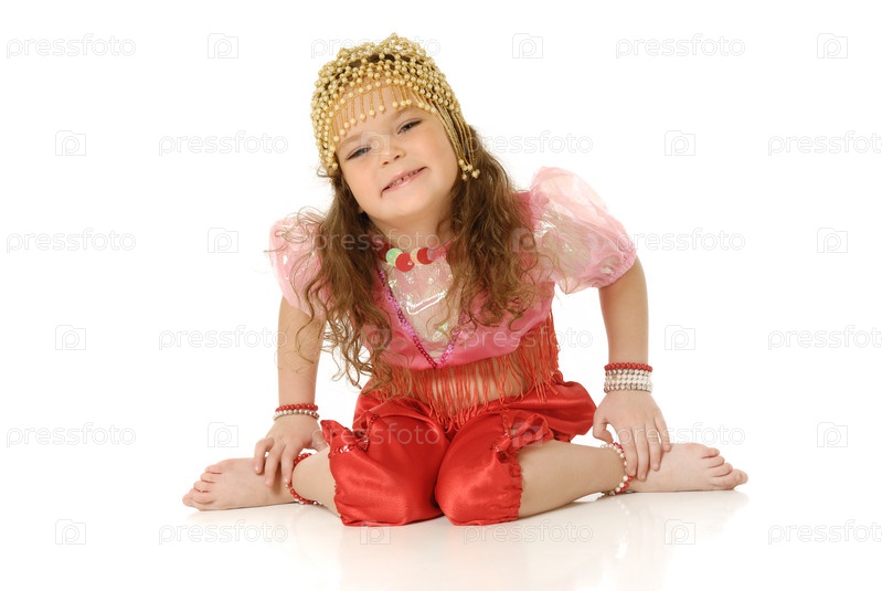 Маленькая девочка в красном костюме на белом фоне