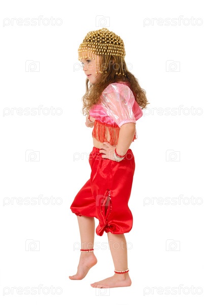 Маленькая девочка в красном костюме на белом фоне