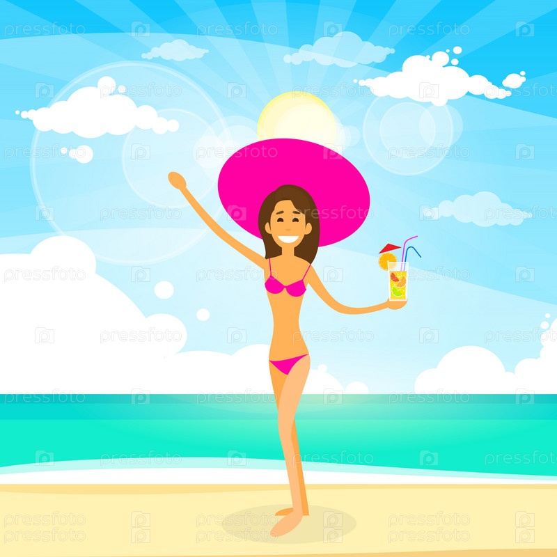 Женщина на пляже летом коктейль, девушка плоский дизайн