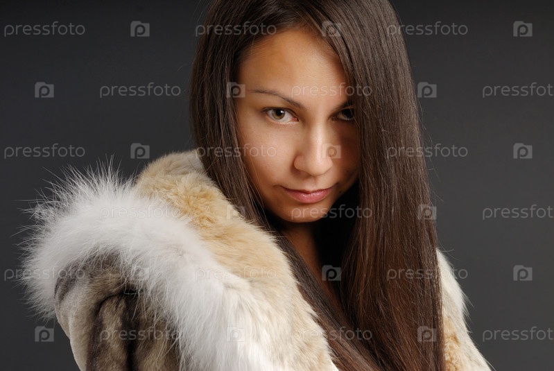Красивая длинноволосая девушка в шубке на черном фоне