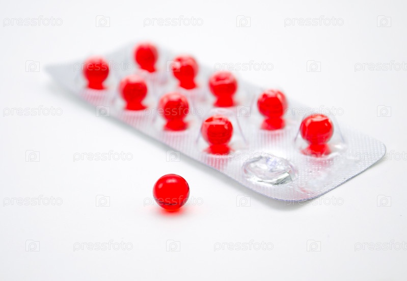 Круглая красная пилюля и упаковка с пилюлями на заднем фоне