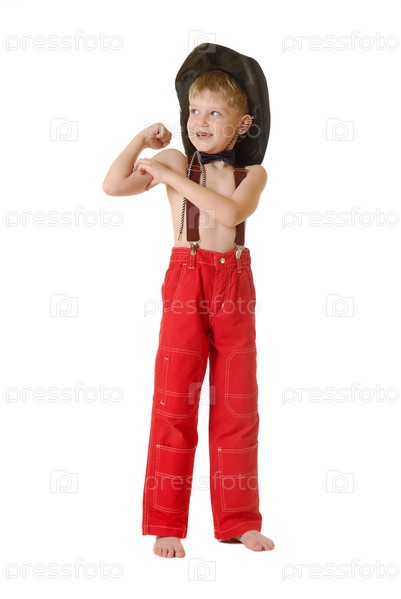 Маленький мальчик в шляпе и красных штанах трогает свой бицепс