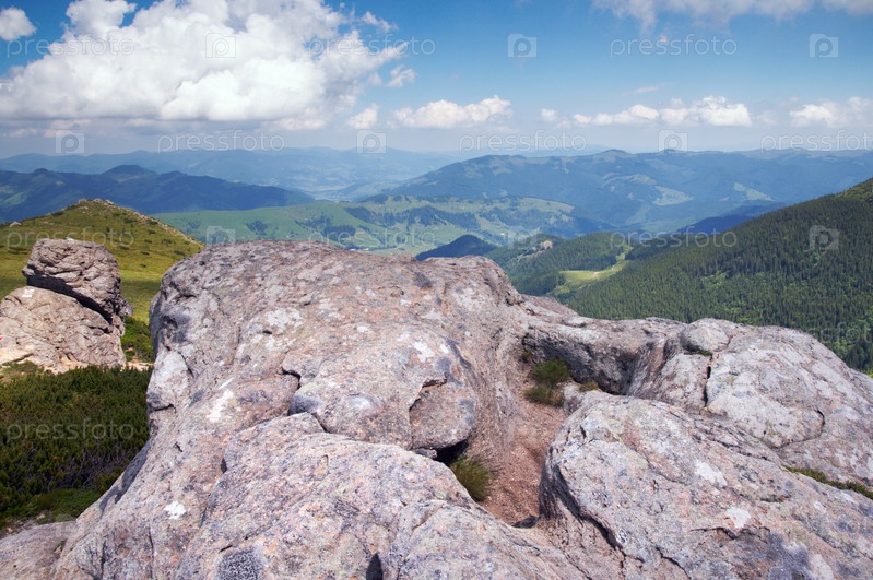 Огромный камень с углублением в форме следа большой ноги на фоне горного пейзажа