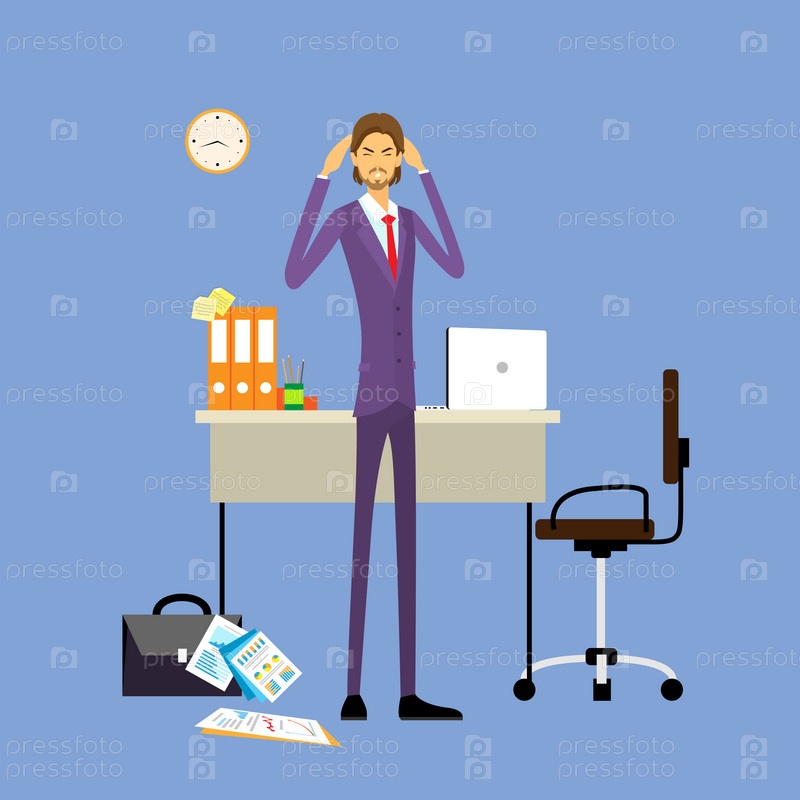 Бизнесмен держать руки на храмы головы, деловой человек концепции подчеркнул, головная боль плоский