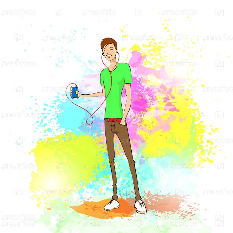 Человек слушать музыку удерживать плеер случайные над краски красочные заставки