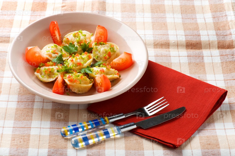 Домашние равиоли с помидорами и зеленью на клетчатой скатерти